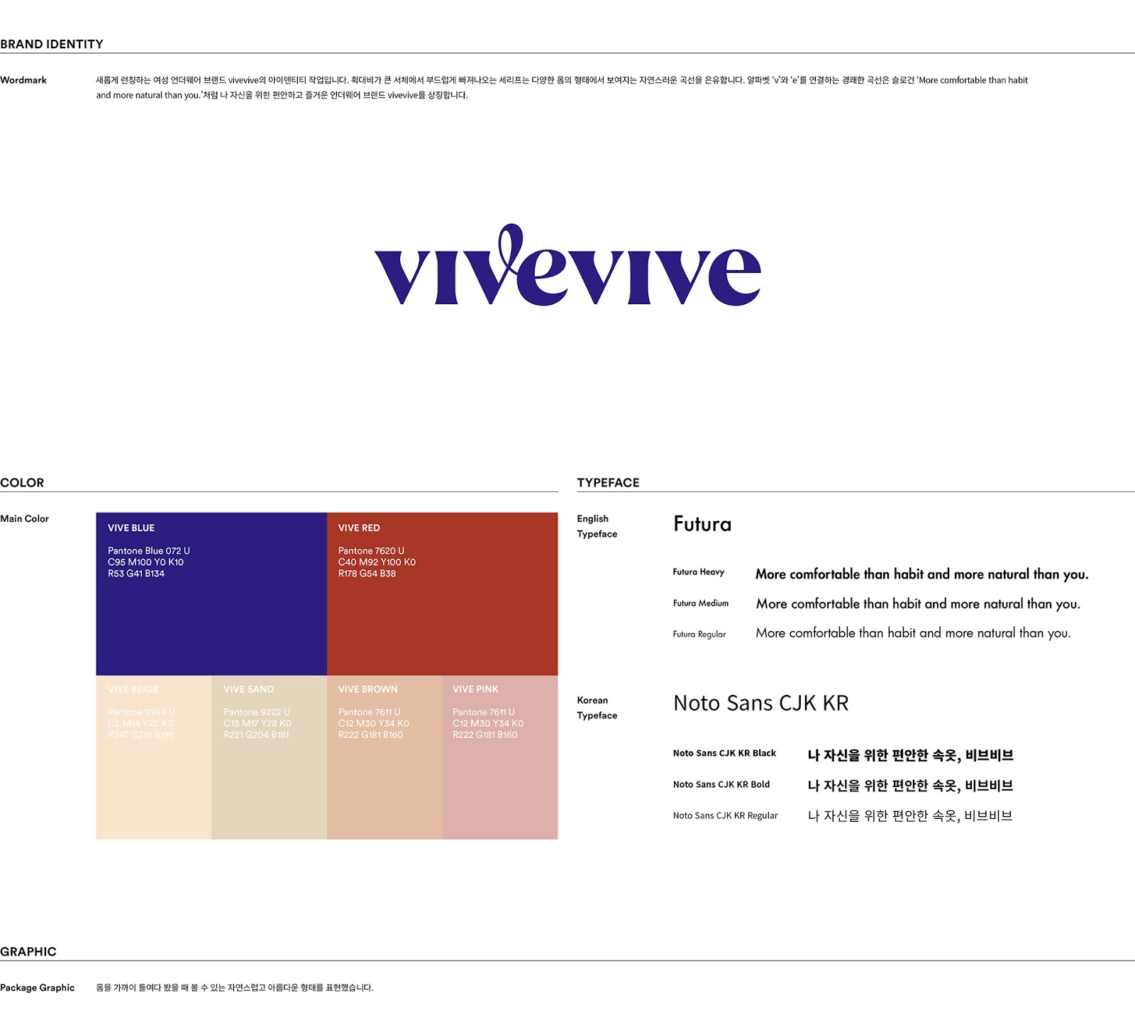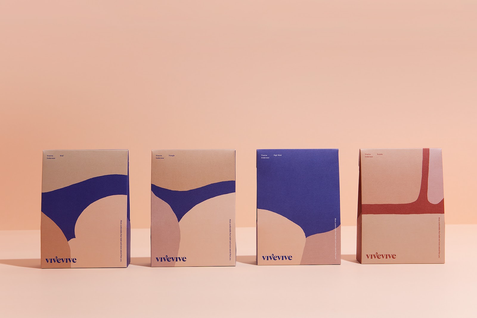 來自于韓國的CFC設(shè)計工作室為女性內(nèi)衣品牌vivevive做的視覺識別和包裝設(shè)計。最自然的身體是美的,CFC用抽象的手法描繪了女性美麗的身體曲線,也用此詮釋著身體最舒適的狀態(tài)。通過對比的大面積色塊拼接來描繪身體局部,很好地抓住了女性身體曲線的特征。又用了膚色的暗淺來描繪局部的光線變化。雖然非常抽象,但能引人聯(lián)想,識別度很高。