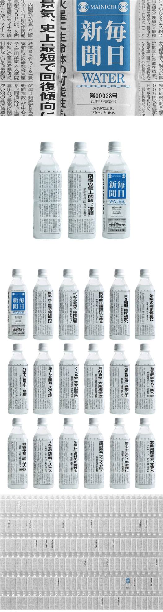 日本的每日新聞發(fā)現(xiàn),買(mǎi)報(bào)紙的年輕人數(shù)量不斷降低,而買(mǎi)瓶裝礦泉水的年輕人卻有所增加。于是設(shè)計(jì)師 Yoshinaka Ono為每日新聞設(shè)計(jì)出承載新聞的礦泉水瓶,一個(gè)月內(nèi)將 31 款新聞瓶子成功推入市場(chǎng)。一個(gè)意外收獲是,用報(bào)紙做產(chǎn)品包裝,逼格不僅沒(méi)有降低,而且在貨架上的識(shí)別度也很高。最終在一個(gè)月的時(shí)間里,幾乎每一個(gè)零售超市平均售出3000瓶這樣的News Bottle礦泉水。可以說(shuō),《每日新聞》既挽提高了銷(xiāo)量,又將用戶引向了移動(dòng)端,包裝的作用意義非凡。