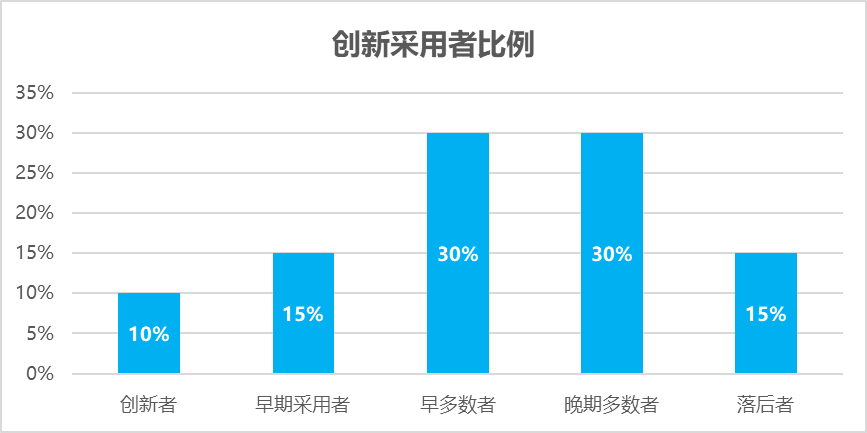 品類創(chuàng)新并不意味著就能獲得市場(chǎng)的認(rèn)可,因?yàn)橄M(fèi)者的認(rèn)知并不是純粹理性,而是受到個(gè)人認(rèn)知、需求、個(gè)性、經(jīng)濟(jì)、社交、文化等各個(gè)層面的影響,不同的消費(fèi)者接受創(chuàng)新產(chǎn)品所需的時(shí)間和條件是不同的,基于該特點(diǎn),社會(huì)學(xué)家提出了著名的“創(chuàng)新采用者理論”,即消費(fèi)者可劃分為五個(gè)類型——?jiǎng)?chuàng)新者、早期采用者、早期多數(shù)者、晚期多數(shù)者和落后者。五大類別消費(fèi)者的平均占比服從統(tǒng)計(jì)學(xué)上的正態(tài)分布:創(chuàng)新者10%、早期采用者15%、早多數(shù)者30%、晚期多數(shù)者30%、落后者15%。